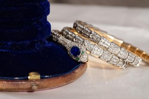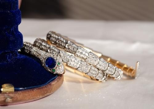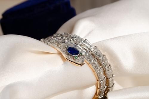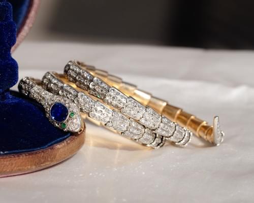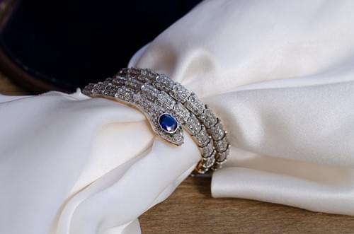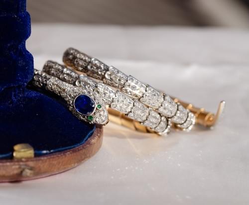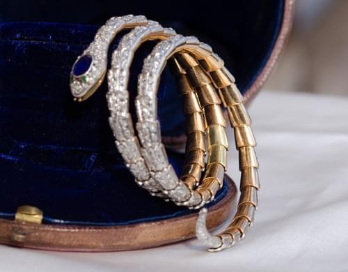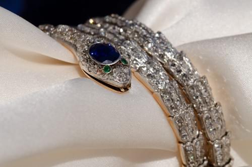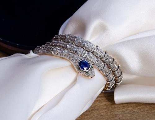 An antique Victorian woven snake bracelet, circa 1880, crafted in gold and set in silver with old-cut diamonds, an oval sapphire on the head and emerald in the eyes.