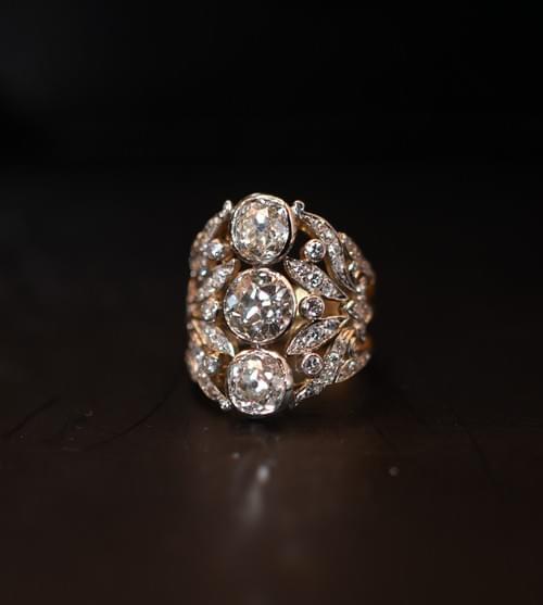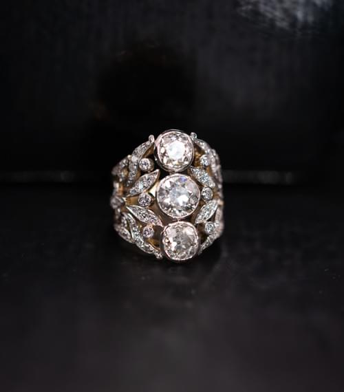 A vintage diamond ring, circa 1920, exquisitely crafted in 18 carats yellow gold, set in silver with European old/cut diamonds. The ring is designed with leaver and gems set with diamonds that converge at the centre into a vertical row composed of 3 large diamonds. The central diamonds measure 6mm, 6.8mm and 5.5mm and are respectively estimated 1.39, 1,64 and 1.17 carats. The total estimated weight of the diamonds set on the ring is 5 carats. The stones are all rub-over set and open back.