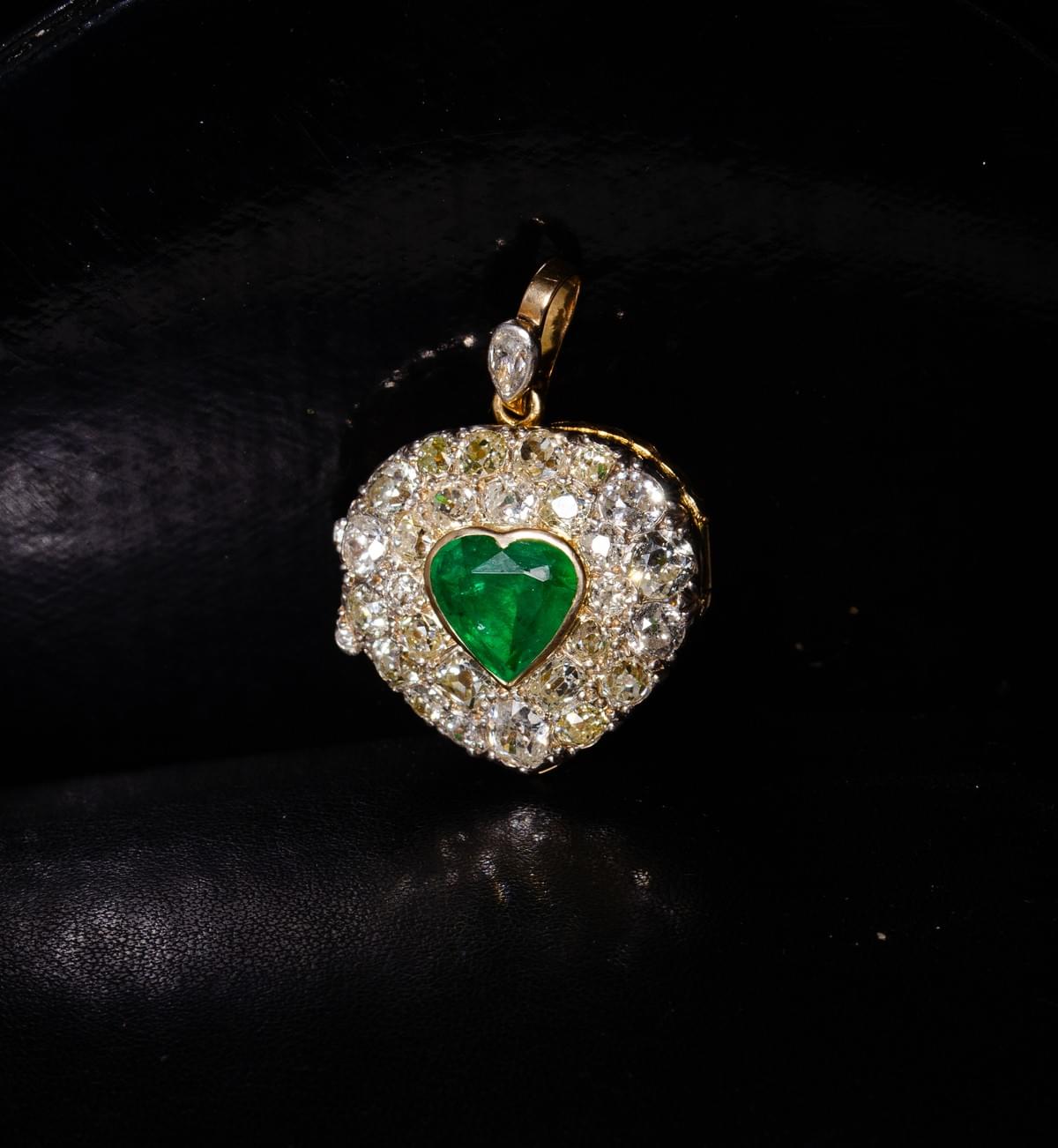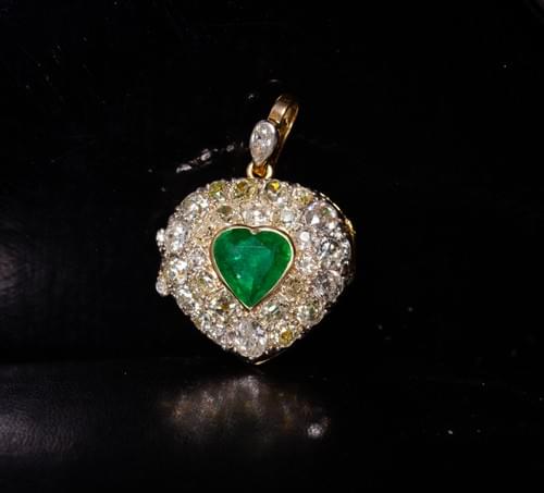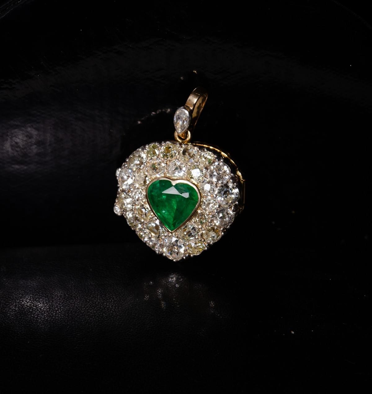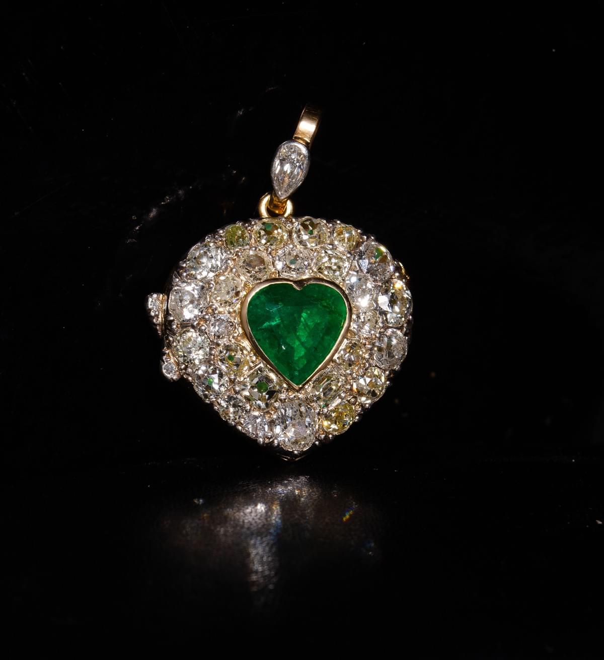 A Victorian locket, circa 1900, designed as a heart, crafted in 18 carats yellow gold, set with a central emerald surrounded with diamonds.