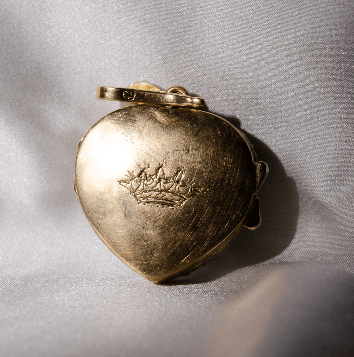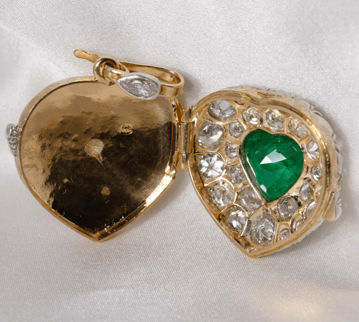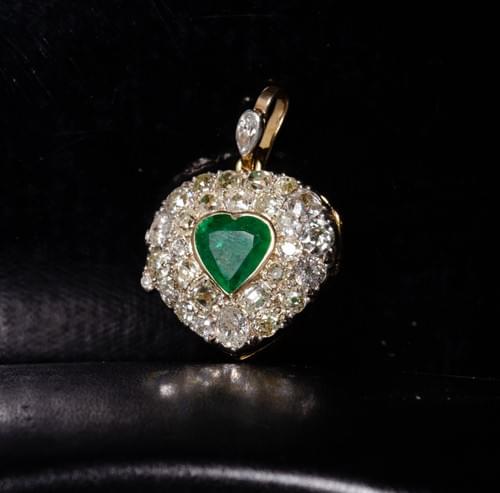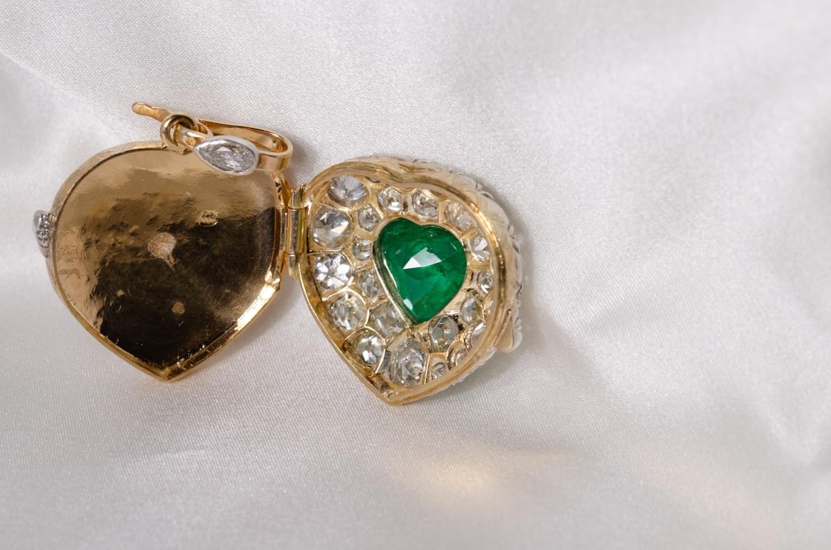 A Victorian locket, circa 1900, designed as a heart, crafted in 18 carats yellow gold, set with a central emerald surrounded with diamonds.