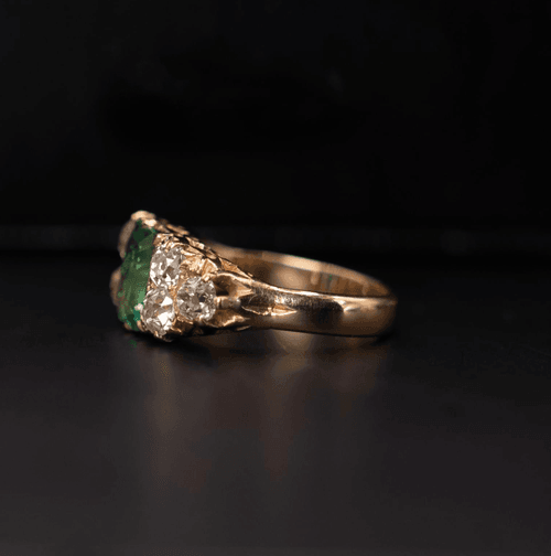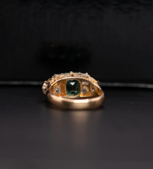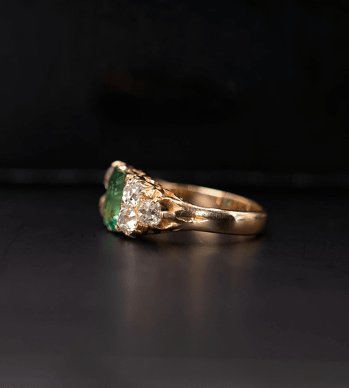 A vintage ring, circa 1900, throughly crafted in 18 carats yellow gold, set with a central emerald of Colombian origin certificated, flanked by 3 old cut diamonds on each shoulder.