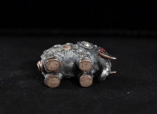 Its surface is delicately adorned with old‑cut diamonds in different measures and colour. The eyes are set with natural rubies, adding a vivid touch of colour and enhancing the lifelike expression of the piece.