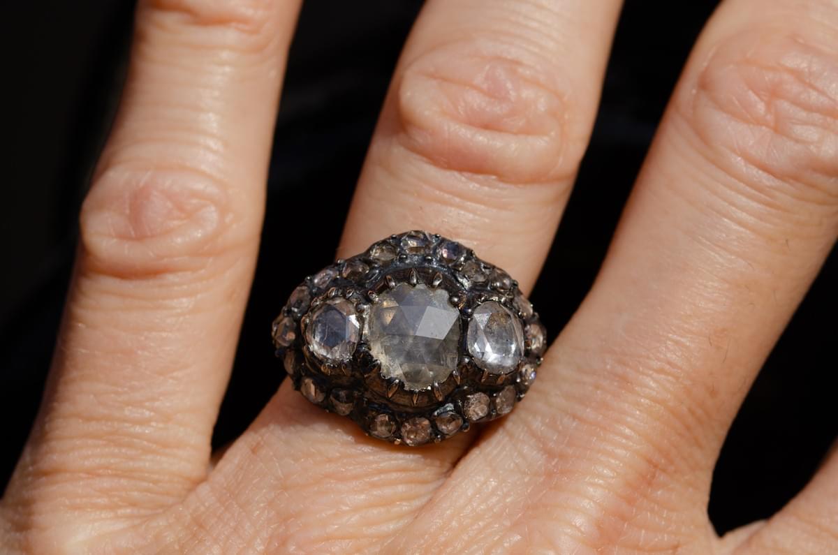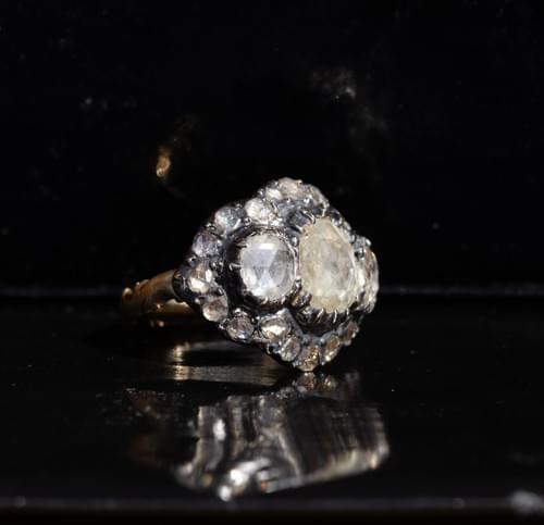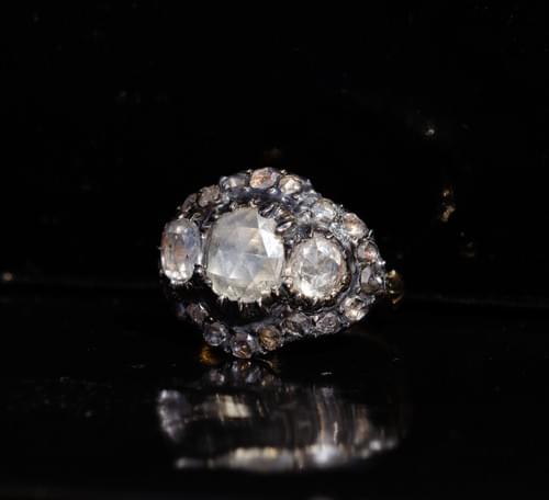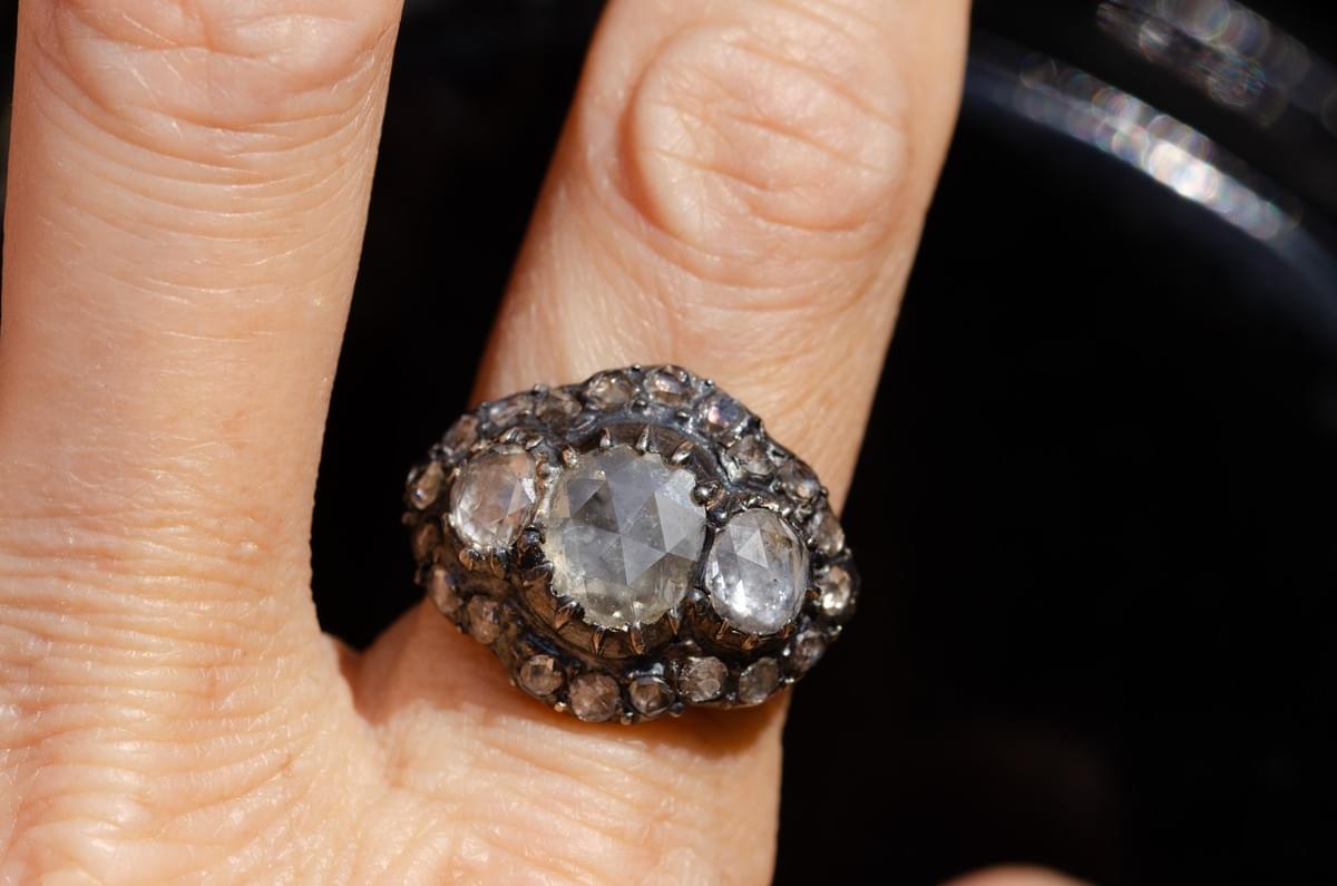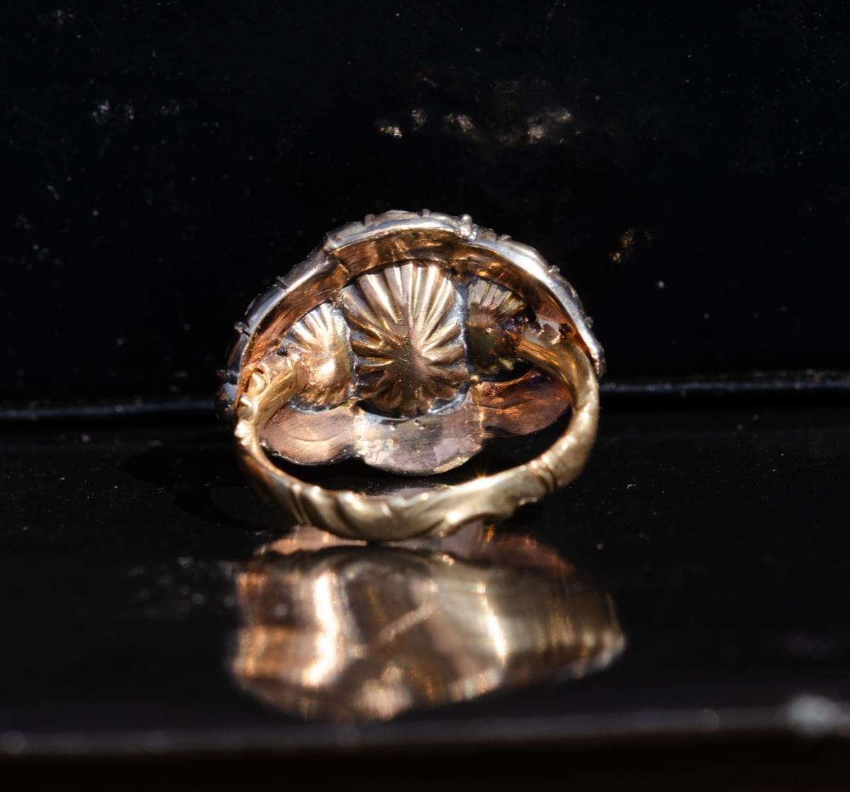 A statement antique ring, circa 1800, crafted in 14 carats yellow gold, featuring a silver top set East-wets with three oval rose-cut diamonds bordered all around with smaller round ones. The three central diamonds measure approximately 5mm x 3.8mm, 6.5mm x 5mm and 8.5mm x 7mm. The small diamonds measure approximately an average of 2.5mm each.