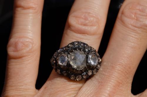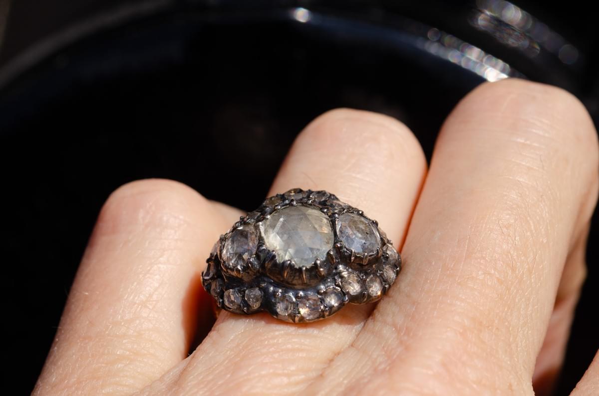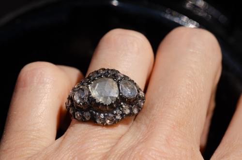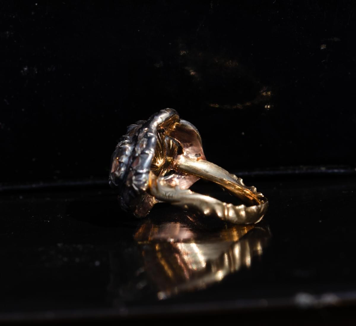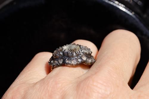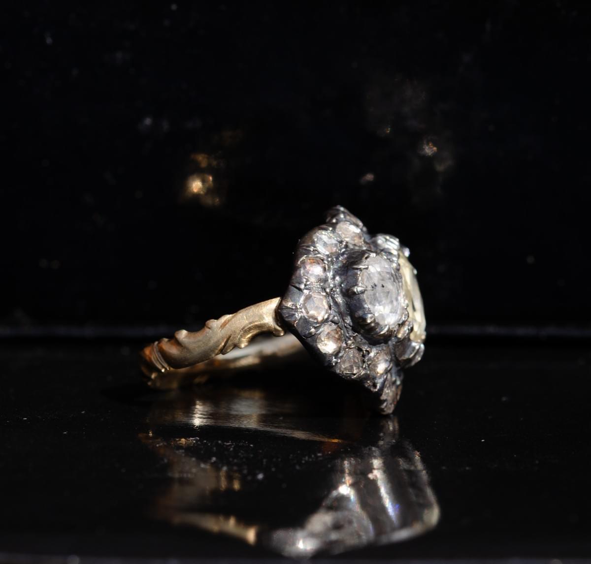 A statement antique ring, circa 1800, crafted in 14 carats yellow gold, featuring a silver top set East-wets with three oval rose-cut diamonds bordered all around with smaller round ones. The three central diamonds measure approximately 5mm x 3.8mm, 6.5mm x 5mm and 8.5mm x 7mm. The small diamonds measure approximately an average of 2.5mm each.
